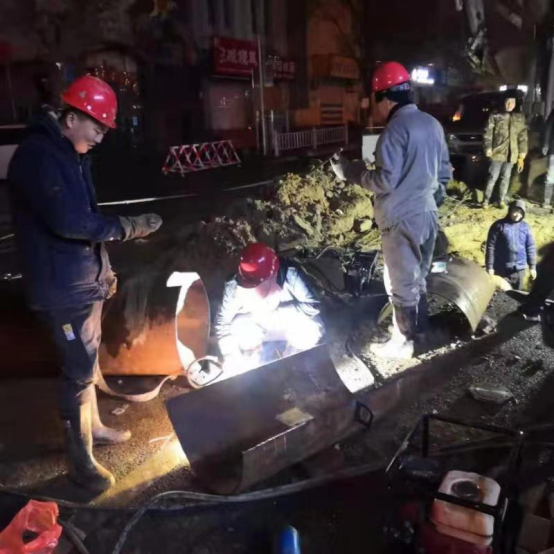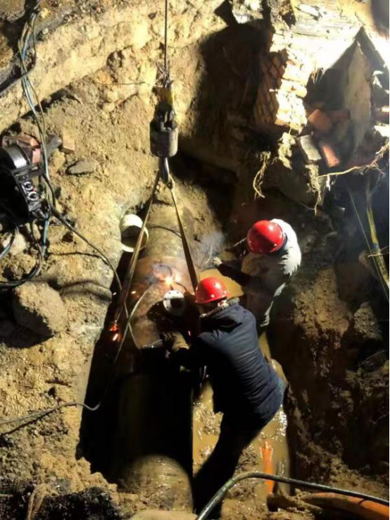 ????? 經(jīng)過(guò)專(zhuān)業(yè)機(jī)械開(kāi)挖,搶修人員準(zhǔn)確確定管道暴漏原因?yàn)镈N500鑄鐵管因氣溫急劇降低發(fā)生應(yīng)力變化,造成金屬管道突然斷裂暴漏,斷裂創(chuàng)面極不規(guī)則,只能現(xiàn)場(chǎng)特制鋼制抱箍修復(fù),搶修難度陡然增加。因損壞管道位置位于老城建成區(qū)內(nèi),地下各類(lèi)管線錯(cuò)綜復(fù)雜,機(jī)械難以展開(kāi),為加快管道搶修進(jìn)度,公司邀請(qǐng)各相關(guān)管線單位現(xiàn)場(chǎng)指認(rèn)各自管線,在確保安全的前提下使用人工為主、機(jī)械為輔的方法加緊搶修基坑開(kāi)挖,搶修人員們歇人不歇崗,在狹小的工作面內(nèi)輪番奮戰(zhàn),確保搶修進(jìn)度。